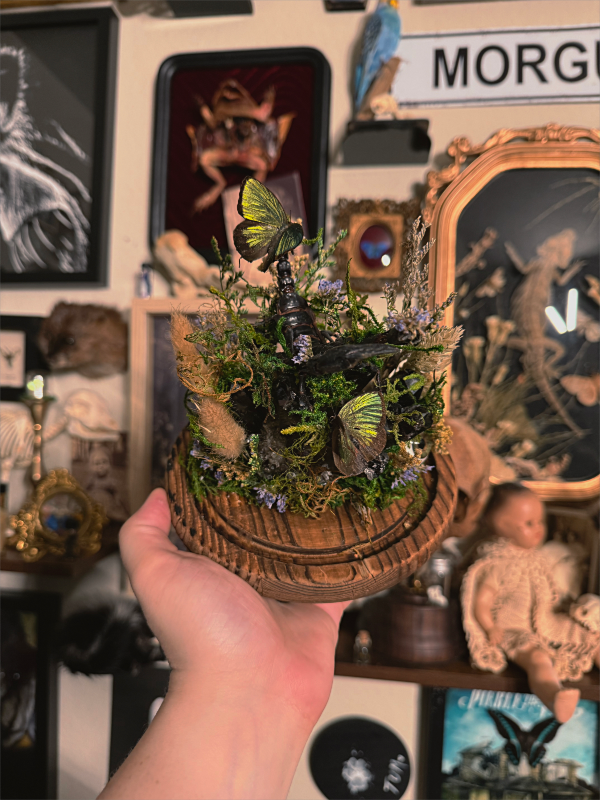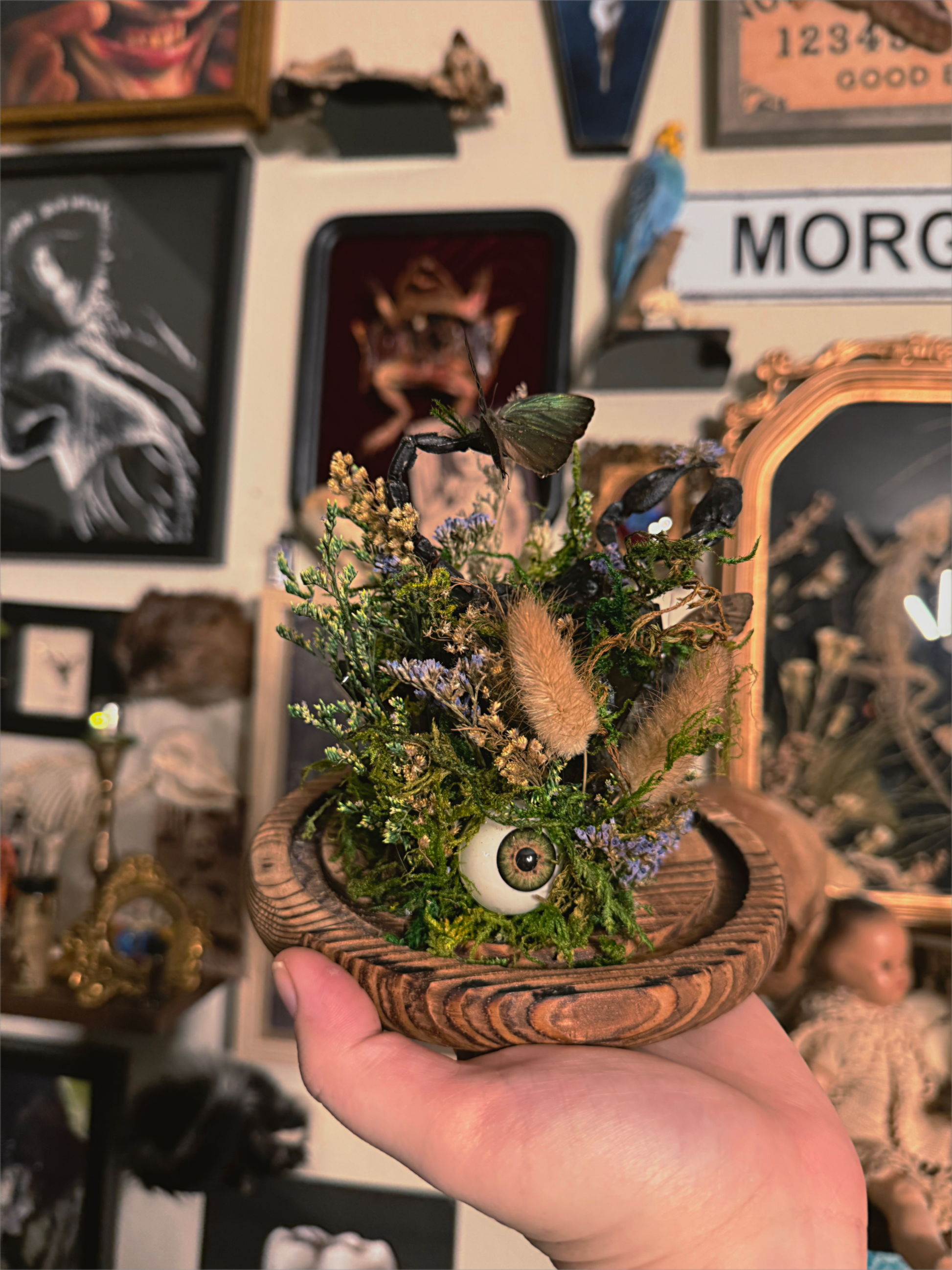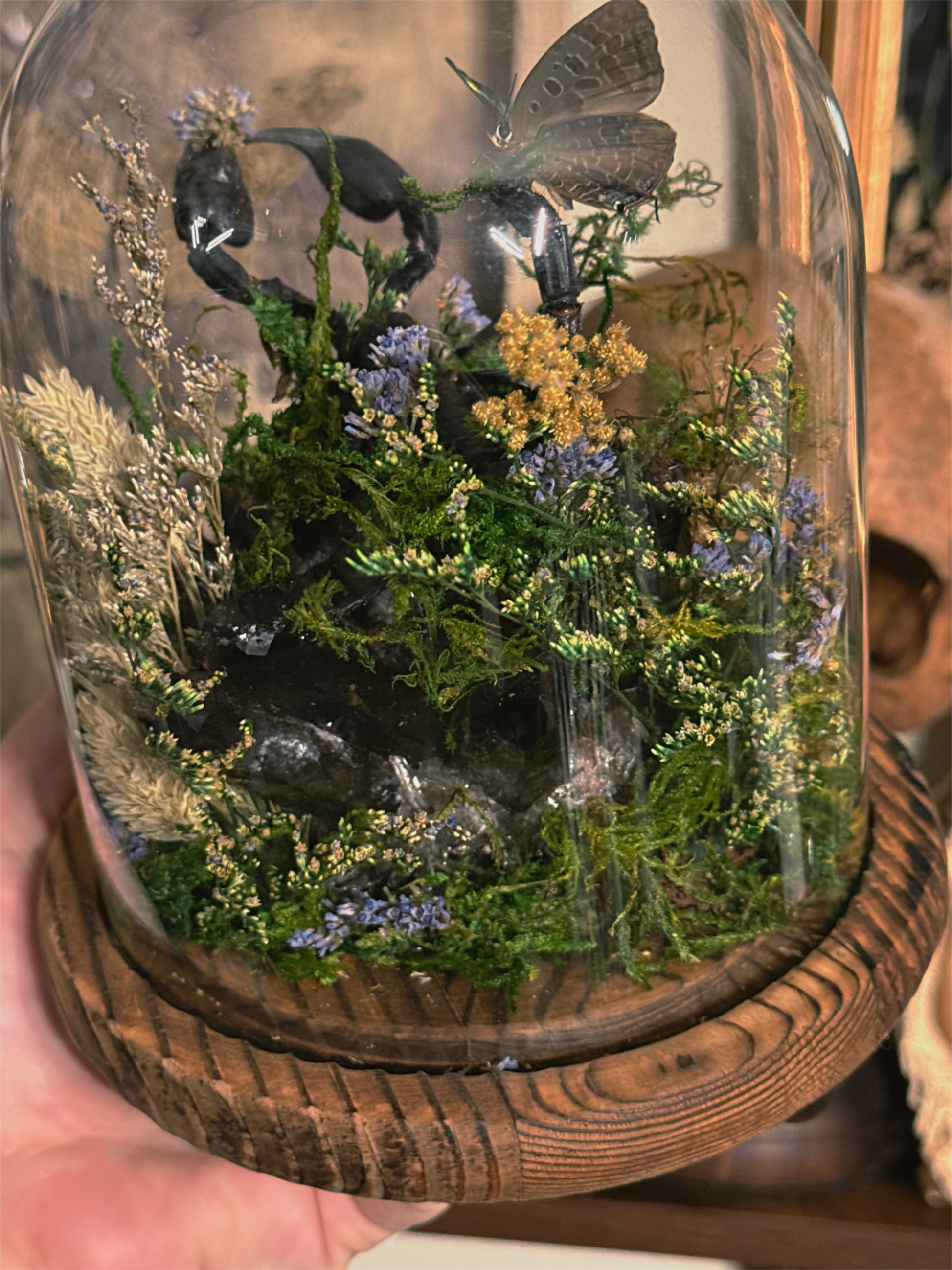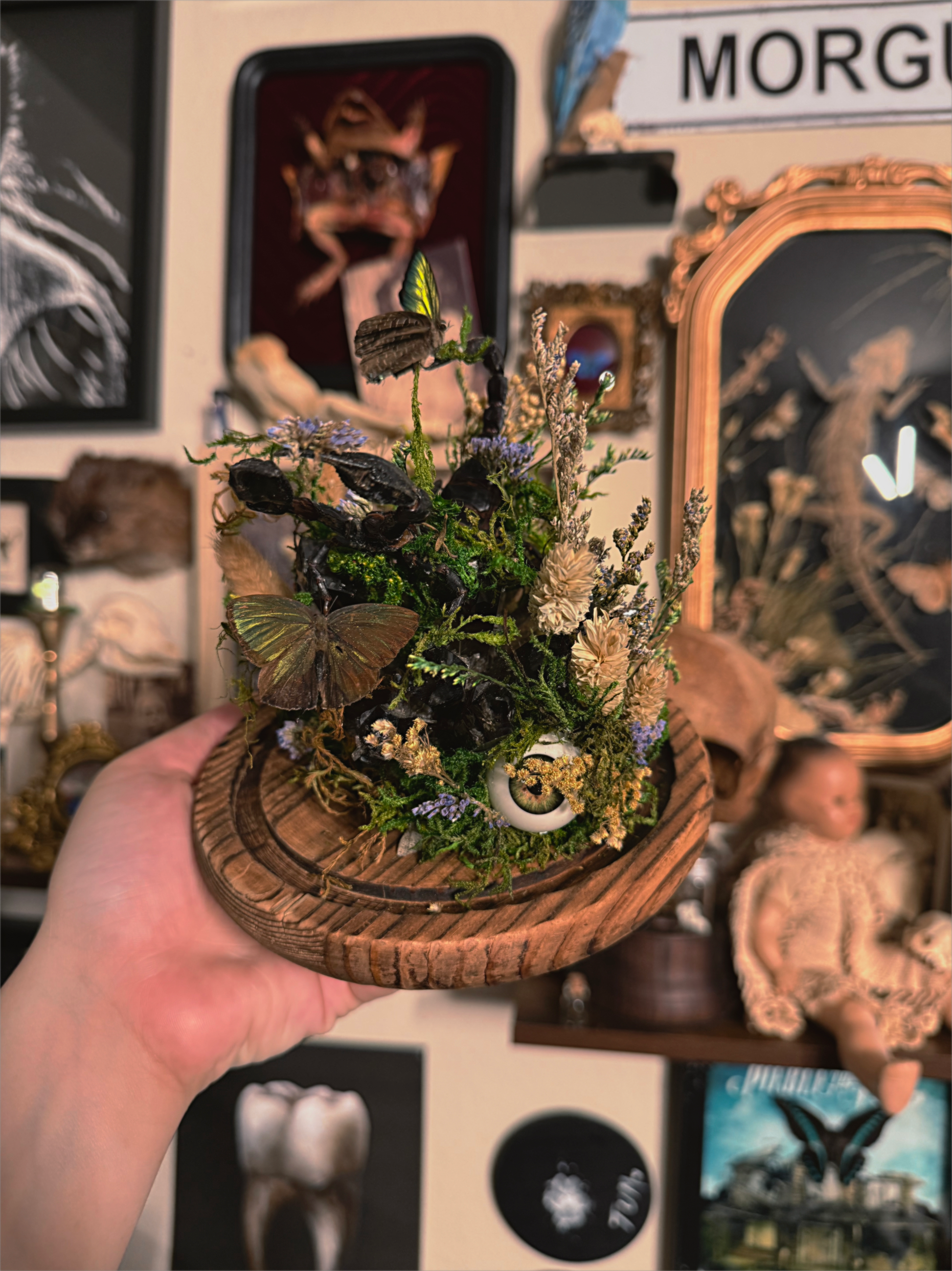 real scorpion & butterflies with eyeballs all sitting on top of a huge black crystal quarts cluster.