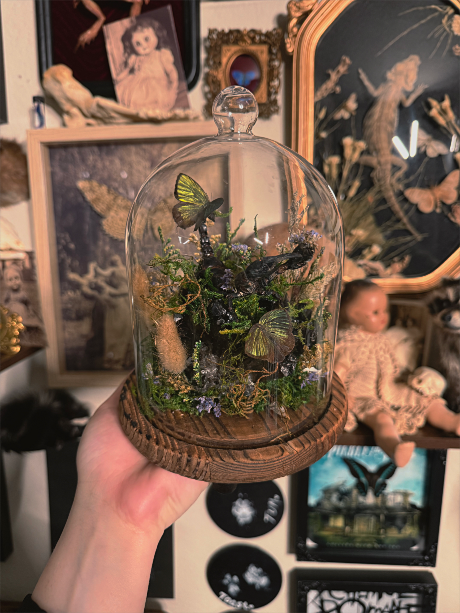 #53 GIANT natural black crystal quarts, Scorpion, eyeball & butterfly Bell dome