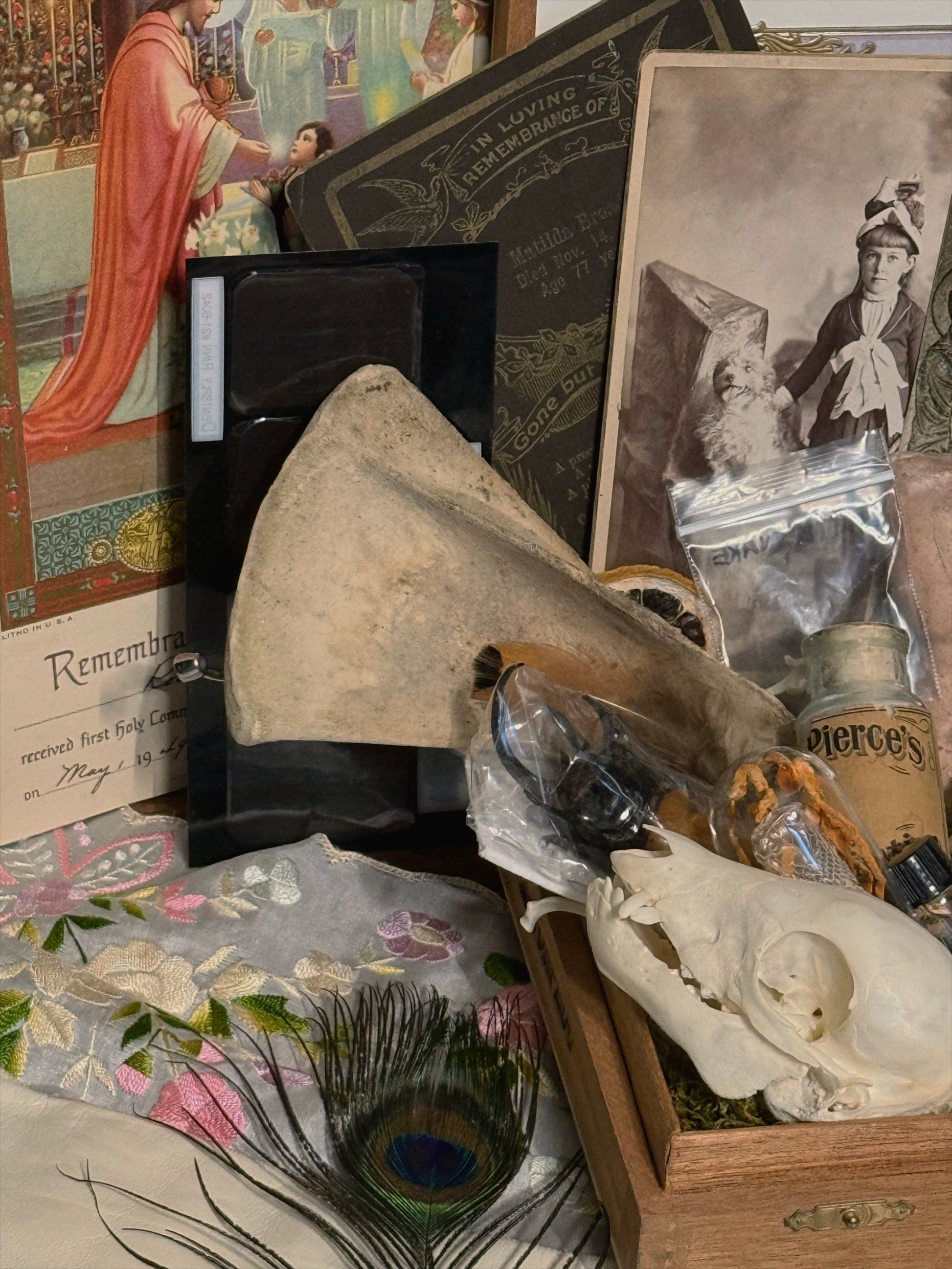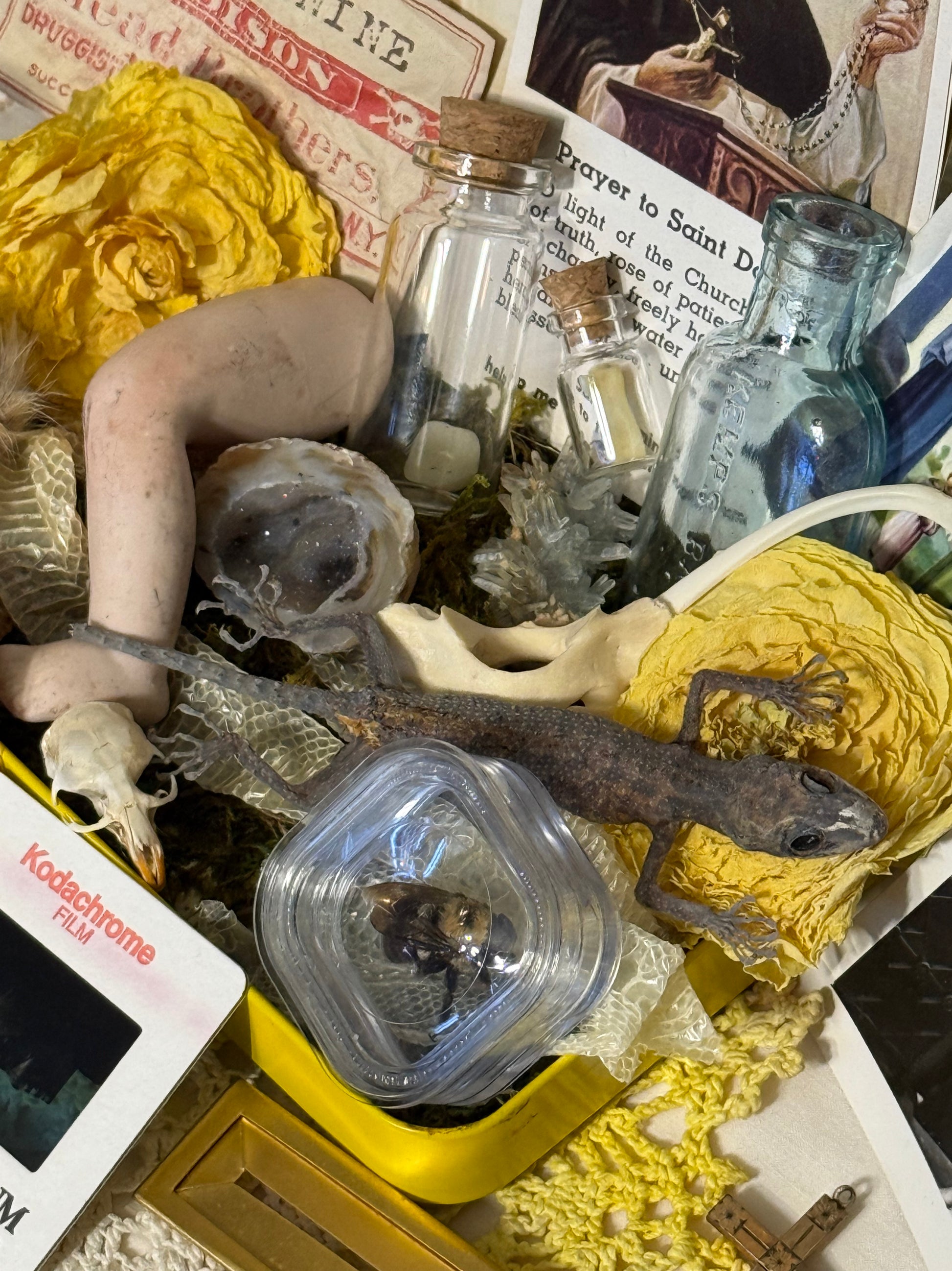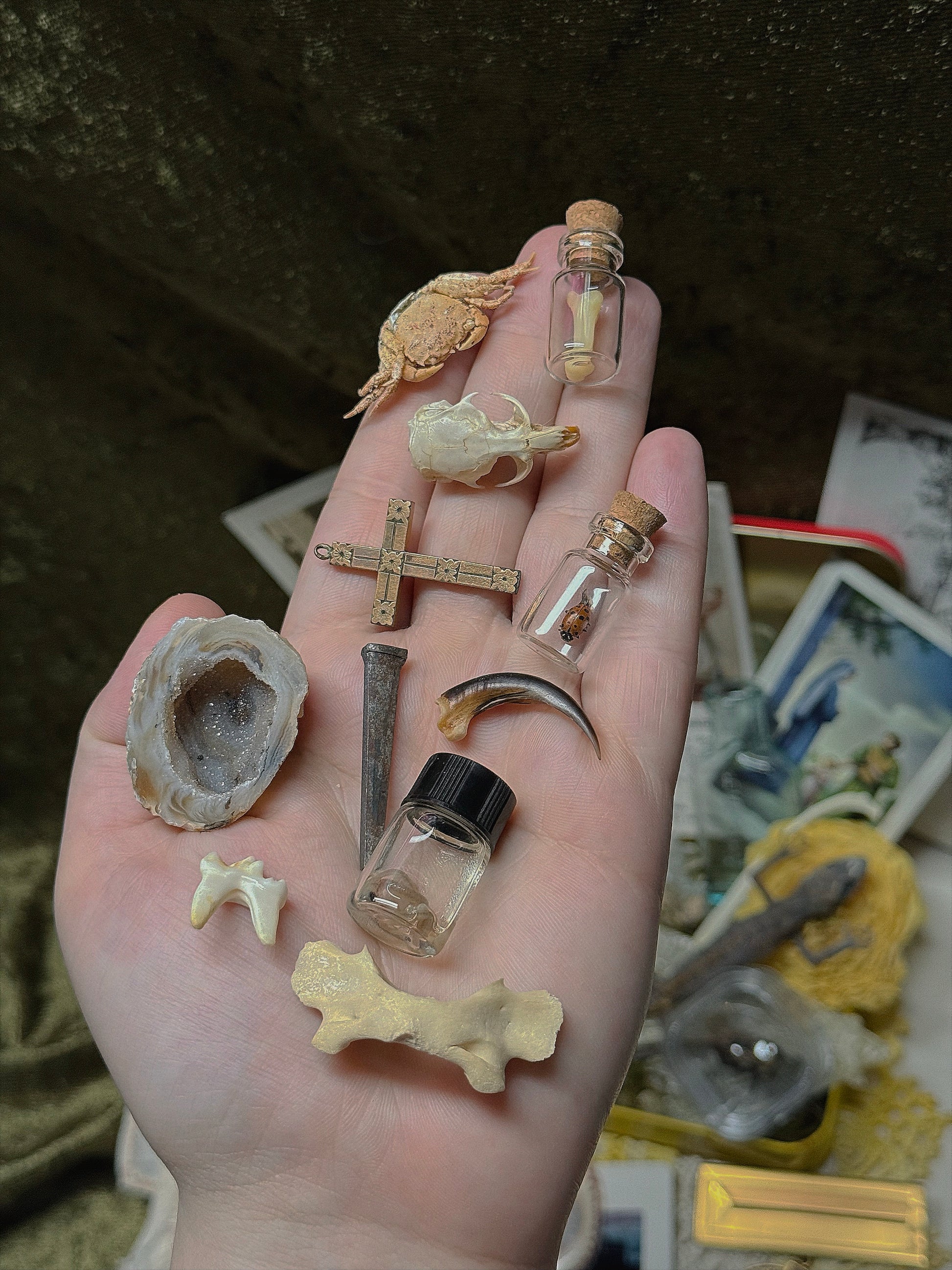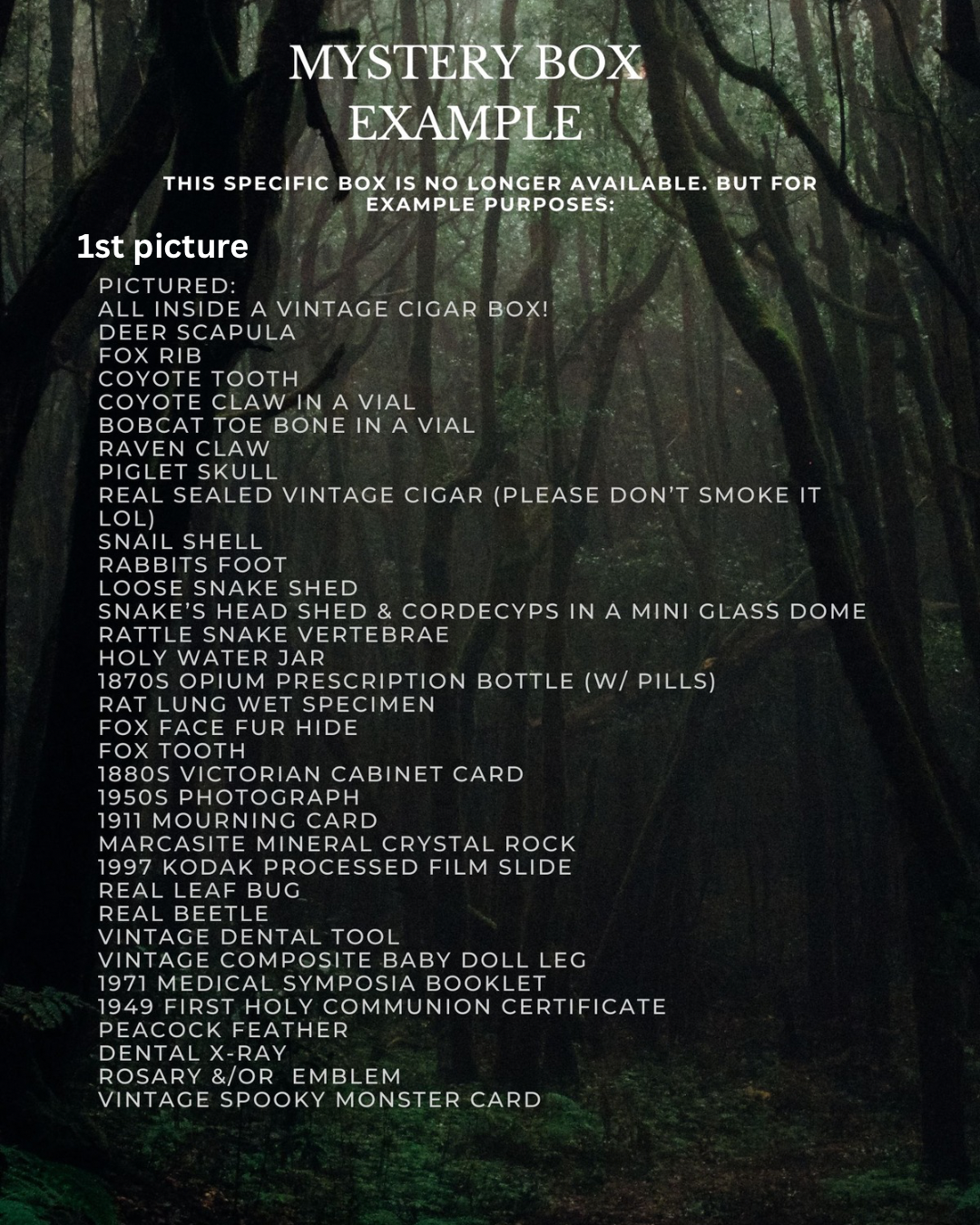 Just because it doesn’t fit in the box doesn’t mean it won’t come in your package!😉 I typically add more to your package than what will fit in each cigar box. I have multiples of most items in the example photos + more that aren’t pictured! I have a very large array of bones, bugs, skulls, vintage, antique, trinkets and treasures 🥹