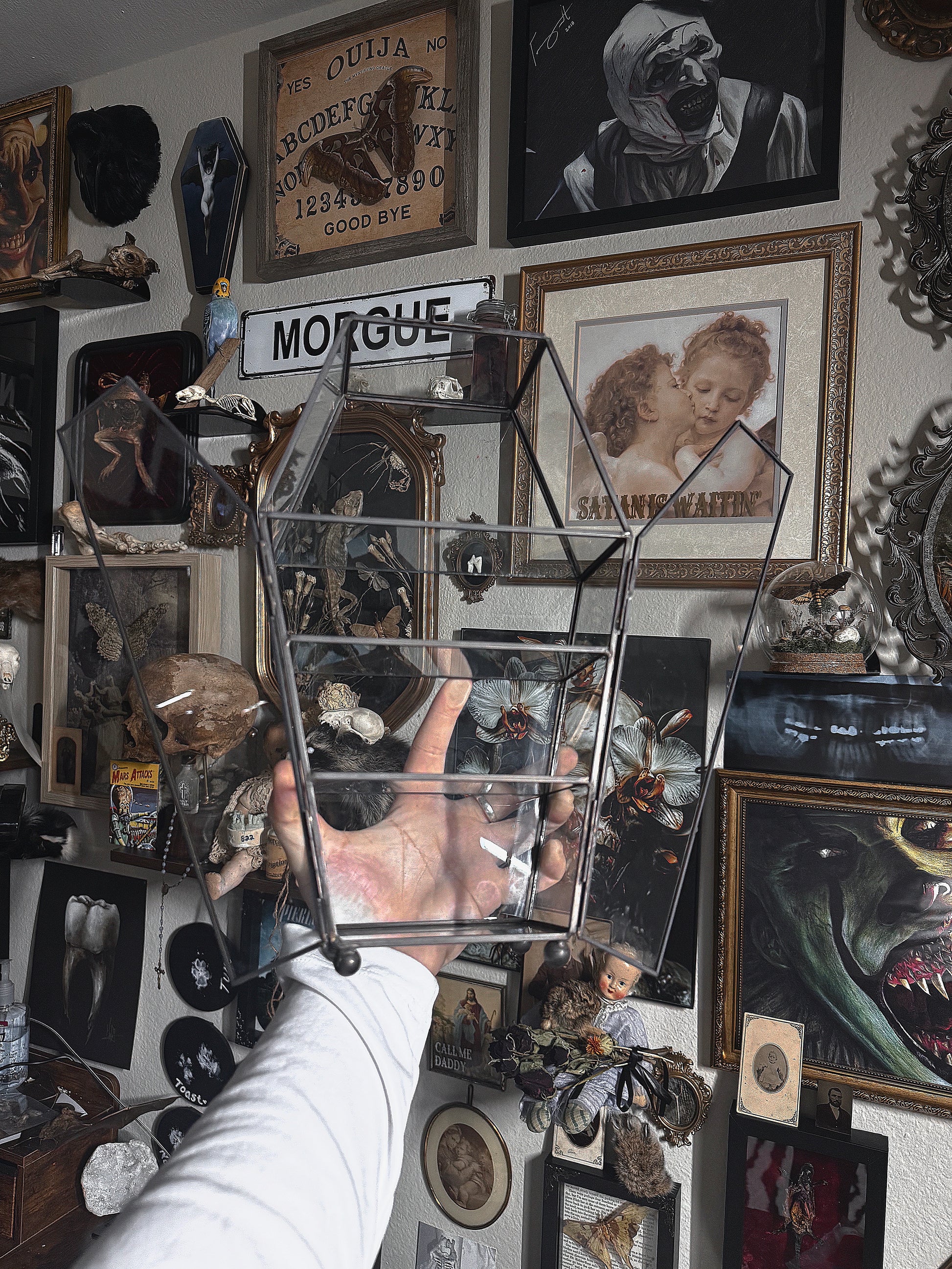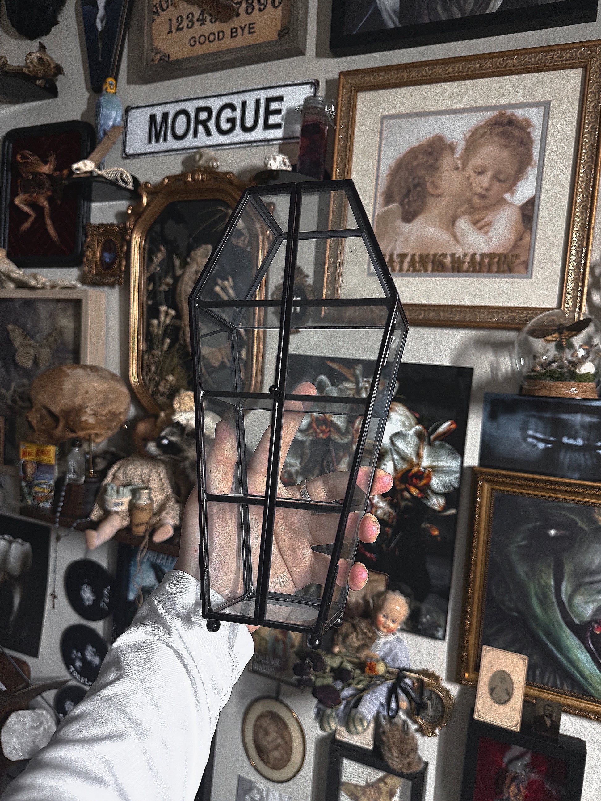 Coffin shaped glass trinket display shelves