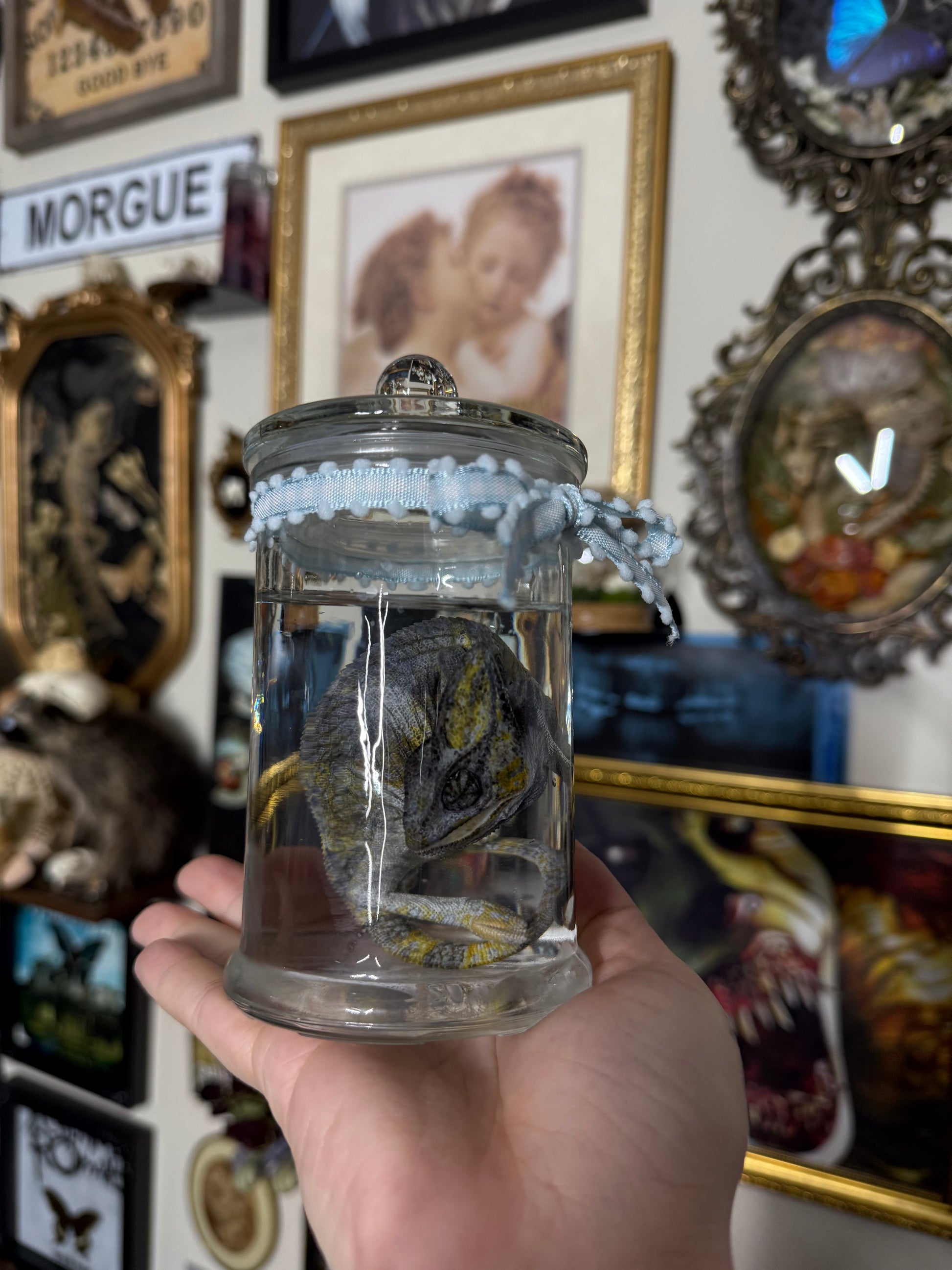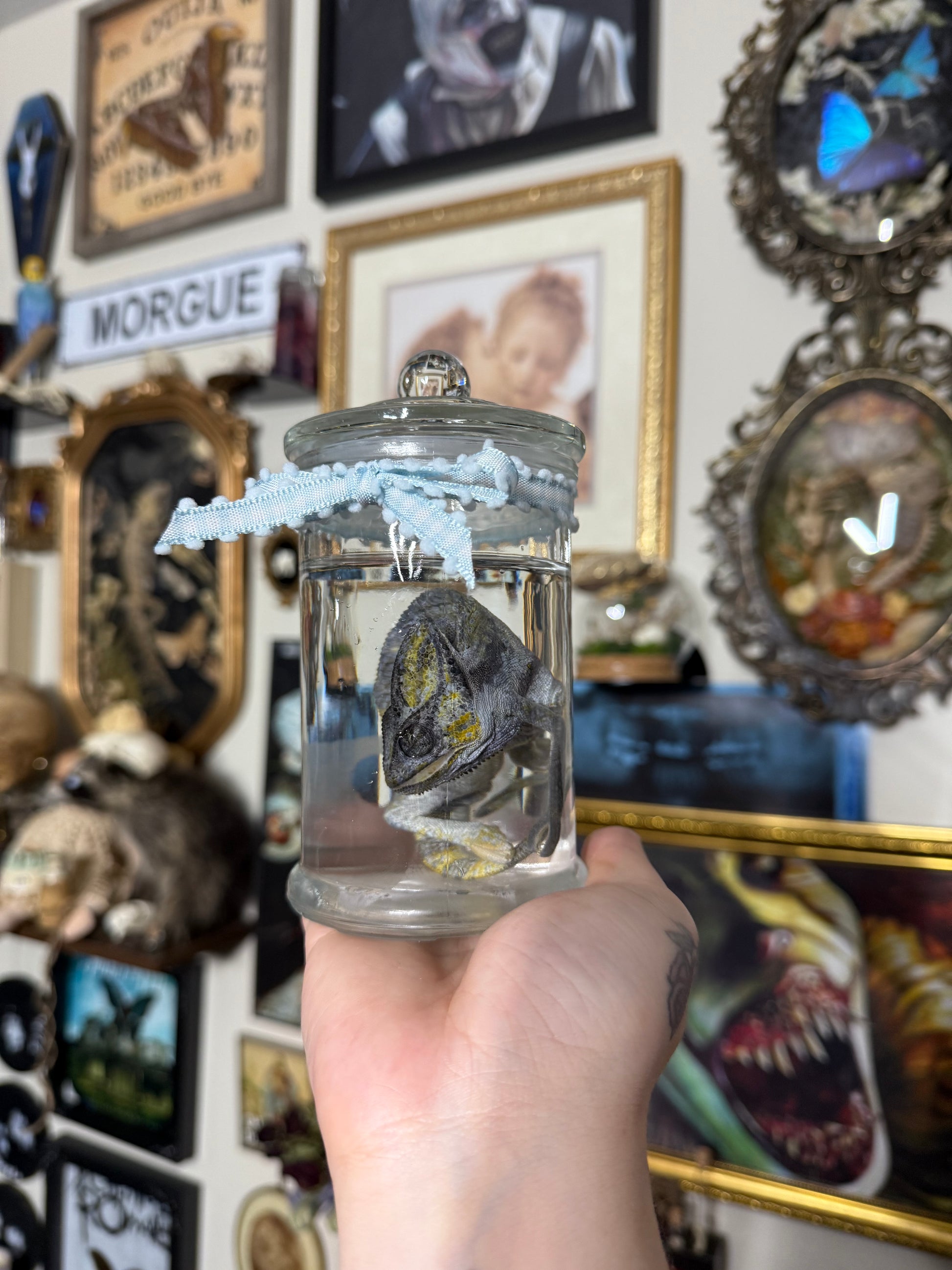 Any lace or ribbon can be removed. I did not use industrial grade adhesive for these in case the buyer chooses to remove them, instead they were glued with hot glue for easy removal. If you need to reattach the ribbon, a glue gun & hot glue sticks will suffice. When exchanging liquids or doing maintenance on your wet specimen, please avoid wetting the ribbon/lace.
